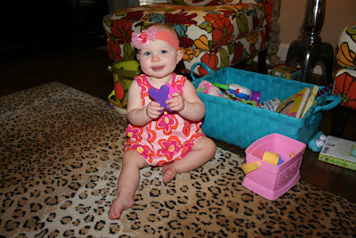 Lucy now weighs 19 lbs and is cutting her second tooth (bottom left) this week. It seems like she learns something new everyday. She is making new sounds and jabbering all the time. She can take a few steps while pushing her shopping cart. Turkey, cheese and Baby Mum Mum's are her new favorite foods this week. Life is good...we are so blessed to have such a wonderful baby!!!